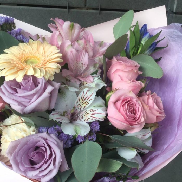 Альстромерия – 2 шт.Роза кустовая – 2 шт.Статица – 1 шт.Эвкалипт – 1 шт.Роза – 2 шт.Гвоздика – 2 шт.Гербера – 1 шт.Гентиана – 1 шт.