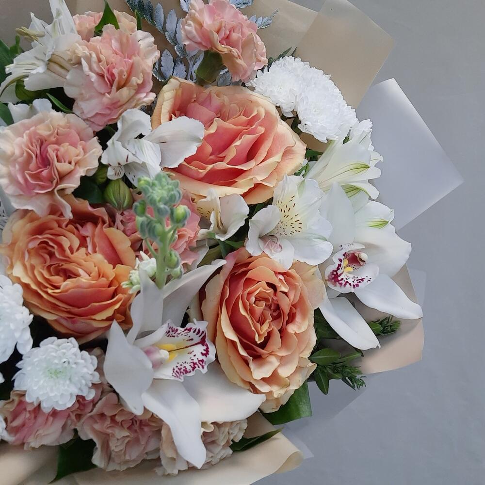 Роза – 3 шт.Альстромерия – 3 шт.Маттиола – 1 шт.Диантус – 3 шт.Сантини – 2 шт.Орхидея Цимбидиум – 2 шт.Папоротник – 1 шт.Рускус – 10 шт.Упаковка дизайнерская – 2 шт.Лента атласная – 1 шт.