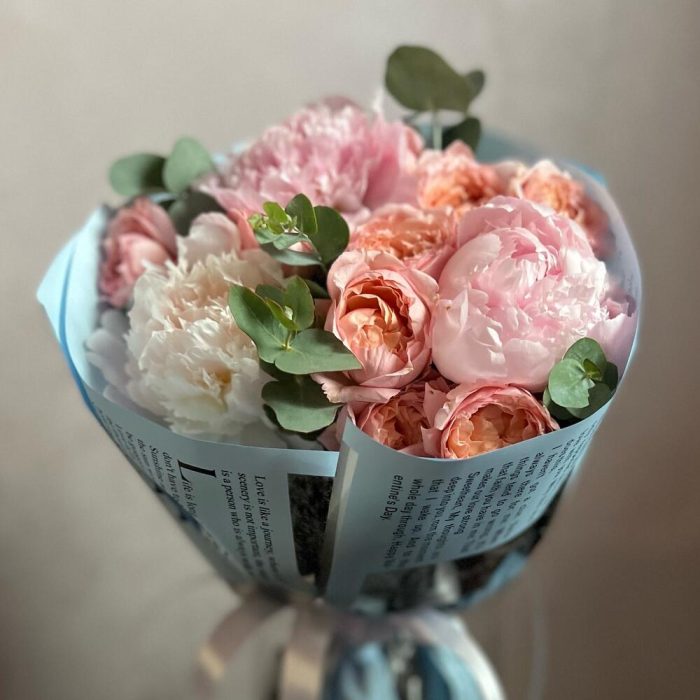 Эвкалипт – 5 шт.Атласная лента – 1 шт.Кустовая пионовидная роза – 2 шт.декоративная упаковка – 1 шт.пионы – 3 шт.