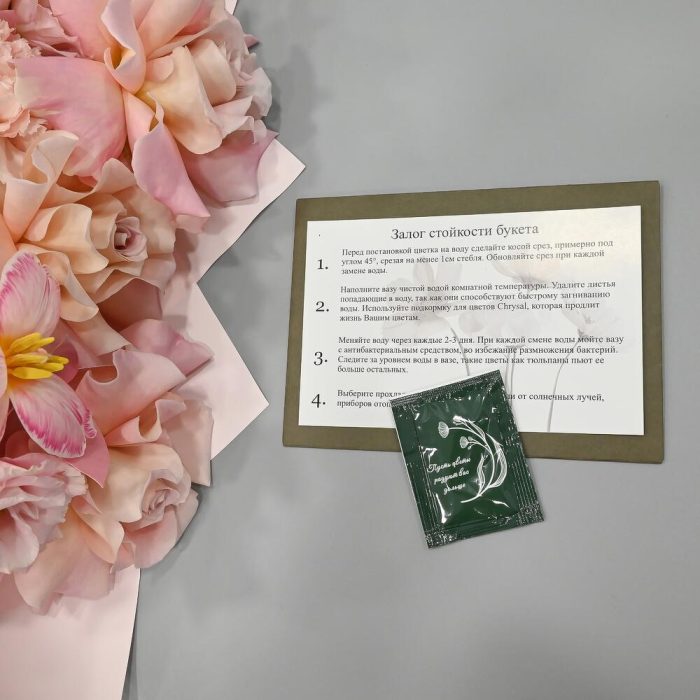 - Сроки возврата: Претензии по качеству букета принимаются в течение 24 часов с момента его получения.