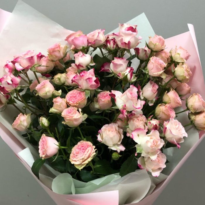 Роза кустовая – 9 шт.Тишью – 1 шт.Пленка матовая – 1 шт.Лента атласная – 1 шт.