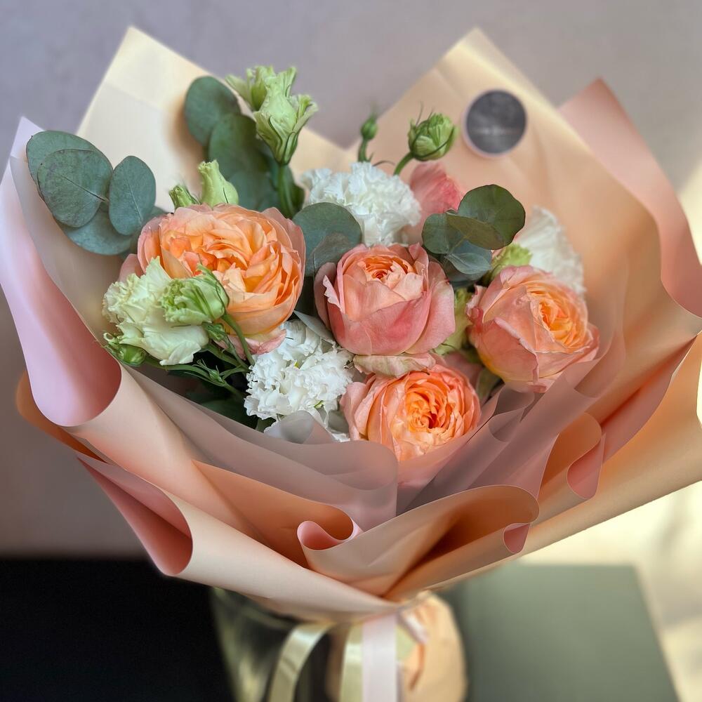 Пионовидная роза – 5 шт.Лизиантус (эустома) – 2 шт.Эвкалипт – 2 шт.Дизайнерская упаковка – 1 шт.Атласная лента – 1 шт.