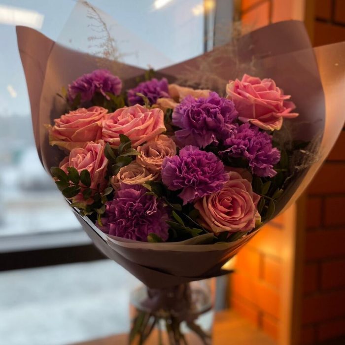Лента – 4 шт.Роза кустовая – 2 шт.Роза – 5 шт.Диантус – 5 шт.Фисташка – 11 шт.Упаковка дизайнерская – 5 шт.