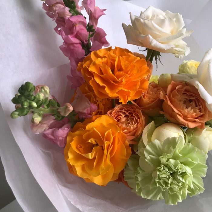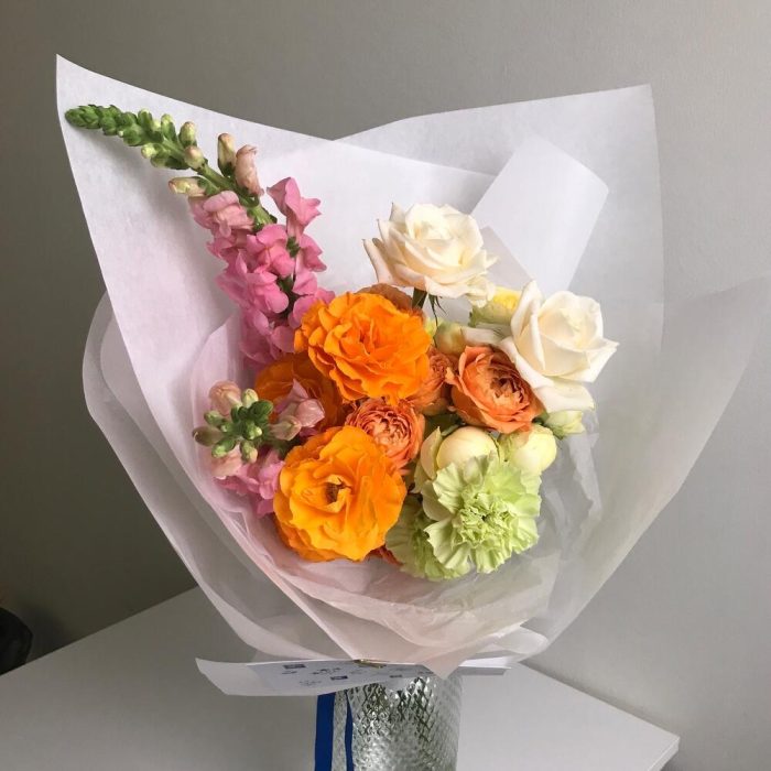 Роза кустовая – 4 шт.Хризантема кустовая – 1 шт.Гвоздика – 2 шт.Роза белая – 2 шт.Роза садовая – 5 шт.антиринум – 2 шт.