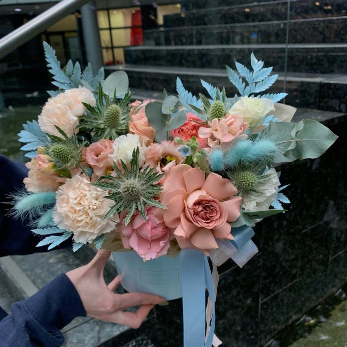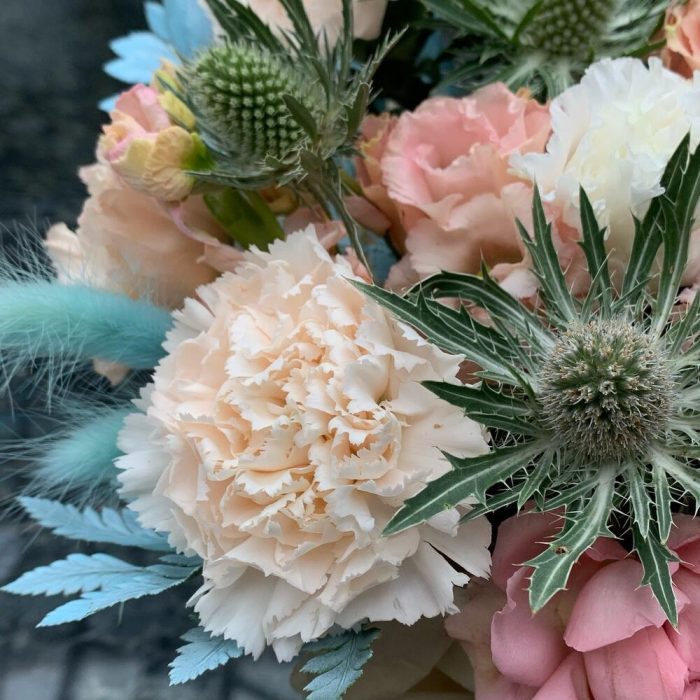 Капучино – 1 шт.диантус брют – 2 шт.Маттиола – 1 шт.Лизиантус – 1 шт.Эрингиум – 1 шт.джульетта роза пионовидная – 1 шт.Папоротник – 1 шт.