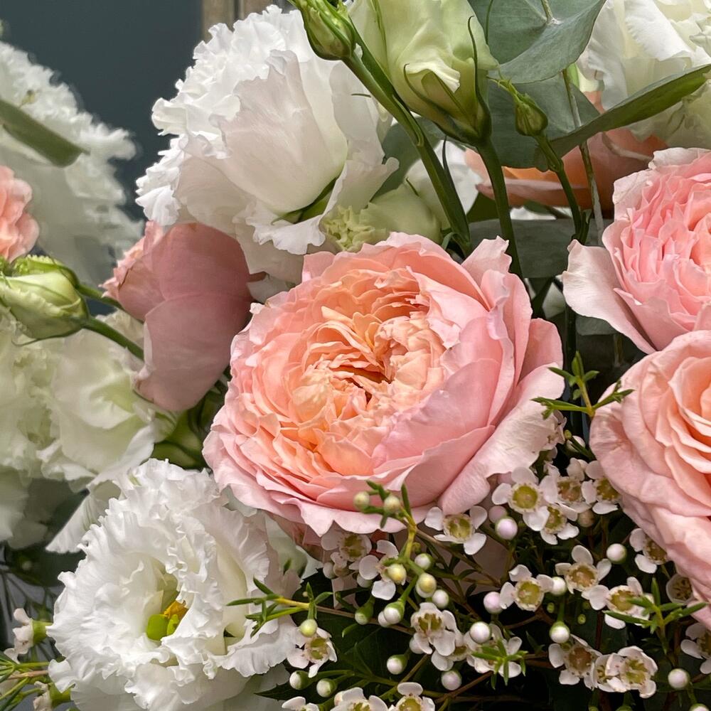 Эвкалипт – 2 шт.Лизиантус – 3 шт.Ваксфлауэр – 1 шт.Роза Джульетта – 3 шт.Коробка – 1 шт.Оазис флористический – 1 шт.