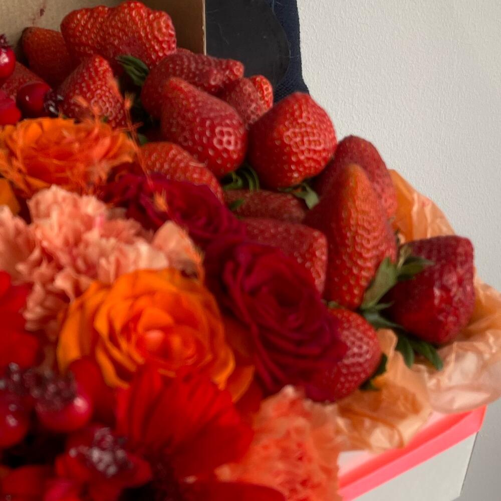 Клубника – 1500 гр.Гербера – 3 шт.Ягоды декоративные – 3 шт.Роза – 11 шт.Диантус – 6 шт.Коробка шляпная – 1 шт.Оазис флористический – 1 шт.