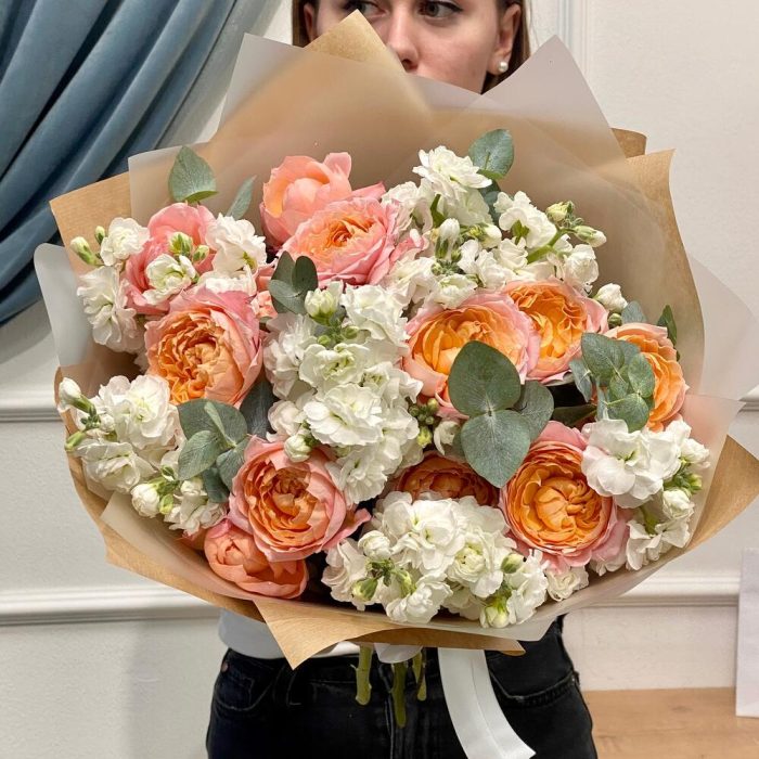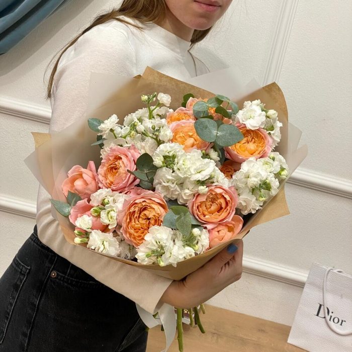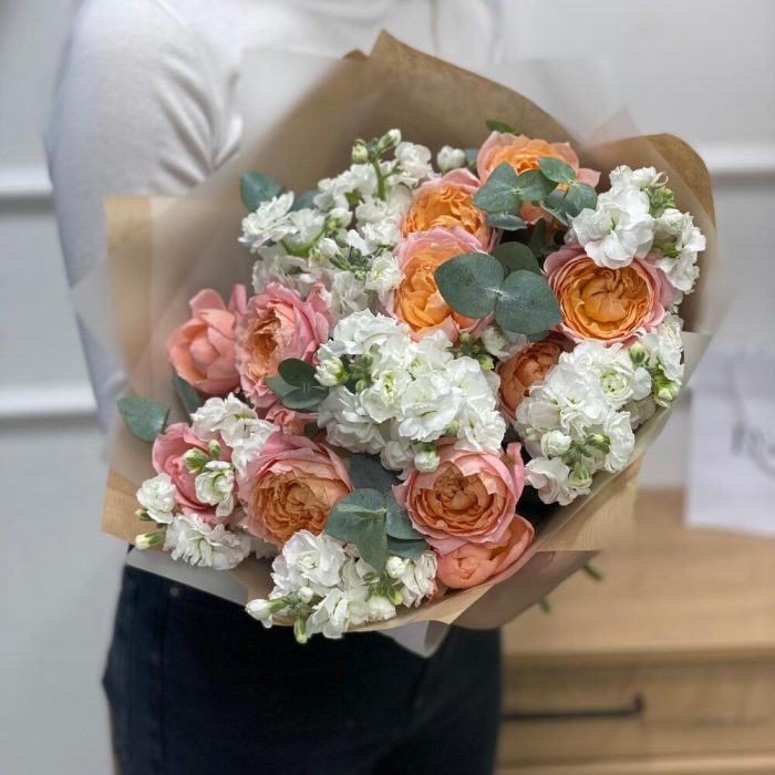Кустовая пионовидная роза – 5 шт.маттиола белая ароматная – 9 шт.Упаковка – 2 шт.эвкалипт 50 – 6 шт.
