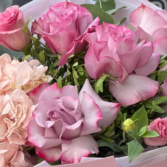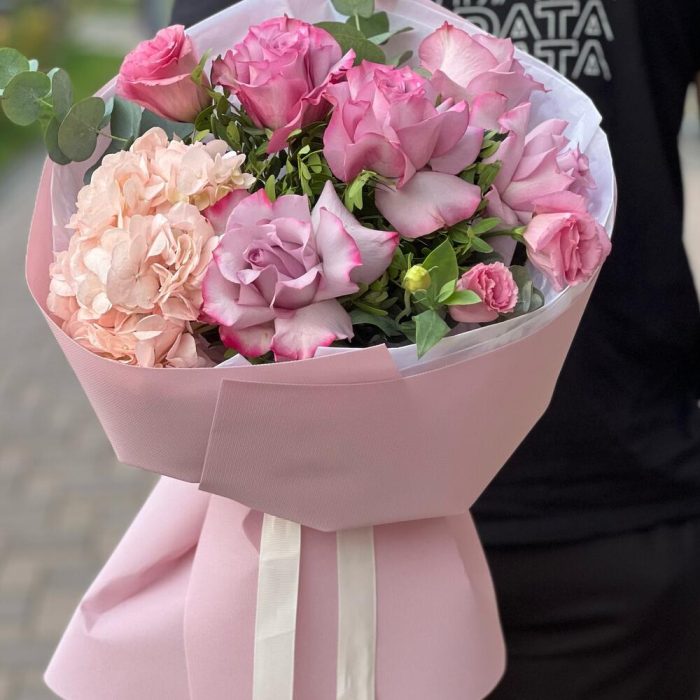 Гортензия – 1 шт. Лизиантус – 2 шт. Роза розовая – 5 шт. Эвкалипт – 1 шт.