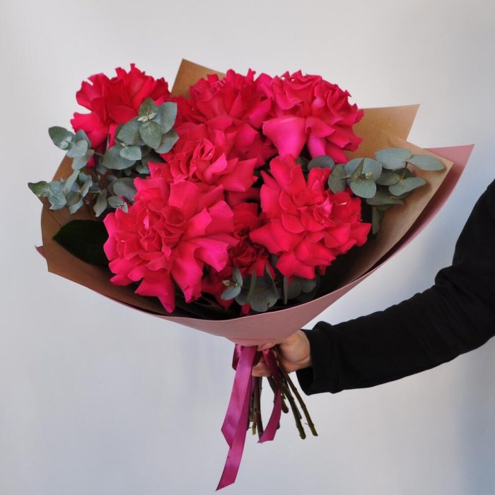 Эвкалипт – 1 шт.Лента атласная – 1 шт.Крафт – 1 шт.Роза французская пионовидная – 7 шт.Фоамиран (упаковка) – 1 шт.