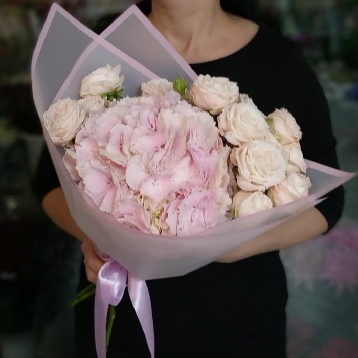 Гортензия – 1 шт.Роза кустовая – 3 шт.Оформление – 1 шт.