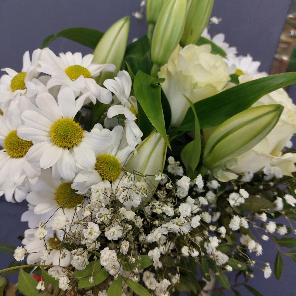 Лилия белая – 2 шт.Хризантема кустовая – 2 шт.Роза Мондиаль – 3 шт.Гипсофила – 1 шт.Фисташка – 3 шт.Лента атласная – 2 шт.