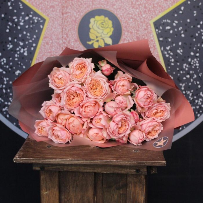 Лента атласная – 1 шт.Пленка дизайнерская – 5 шт.Роза кустовая пионовидная джульетта – 7 шт.