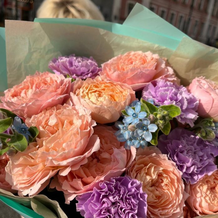 роза пионовидная премиум джульетта – 5 шт.Диантус лунный – 6 шт.твидия голубая – 3 шт.тишью крафтовое – 1 шт.упаковка корейская пленка тиффани – 1 шт.Лента атласная – 1 шт.