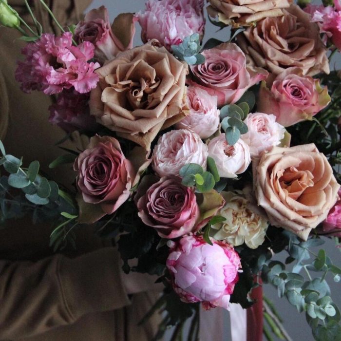 Пион – 4 шт.роза тоффи – 4 шт.Роза сортовая – 5 шт.Роза кустовая пионовидная – 2 шт.Лизиантус – 3 шт.Диантус – 3 шт.Эвкалипт – 7 шт.Лента – 1 шт.
