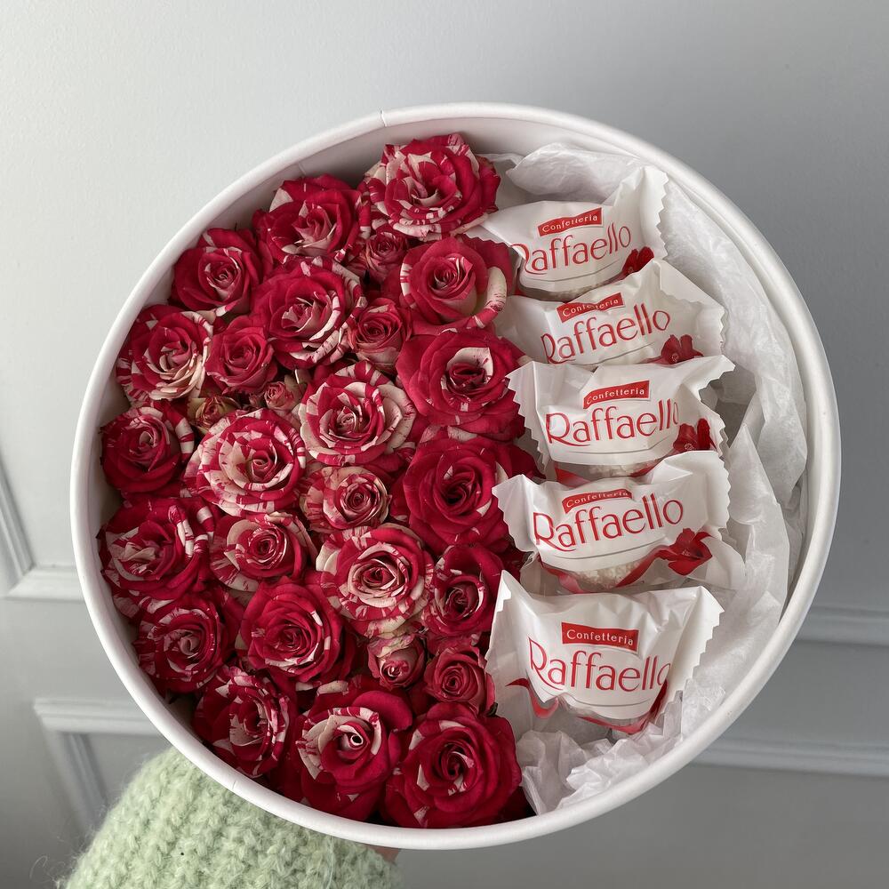 Роза кустовая – 3 шт.цилиндр плоский 21 см – 1 шт.Оазис флористический – 1 шт.Раффаэлло – 5 шт.