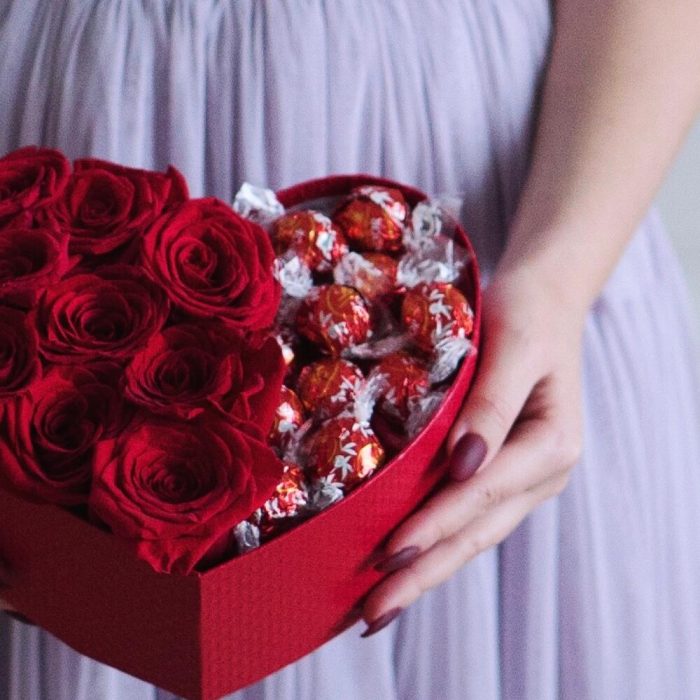 “Сладкое сердце ” – цветочная композиция с сладостями в коробке “Сердце”