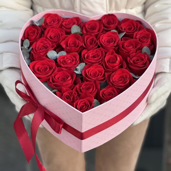 Коробка сердце из 25 красных роз и эвкалипта!