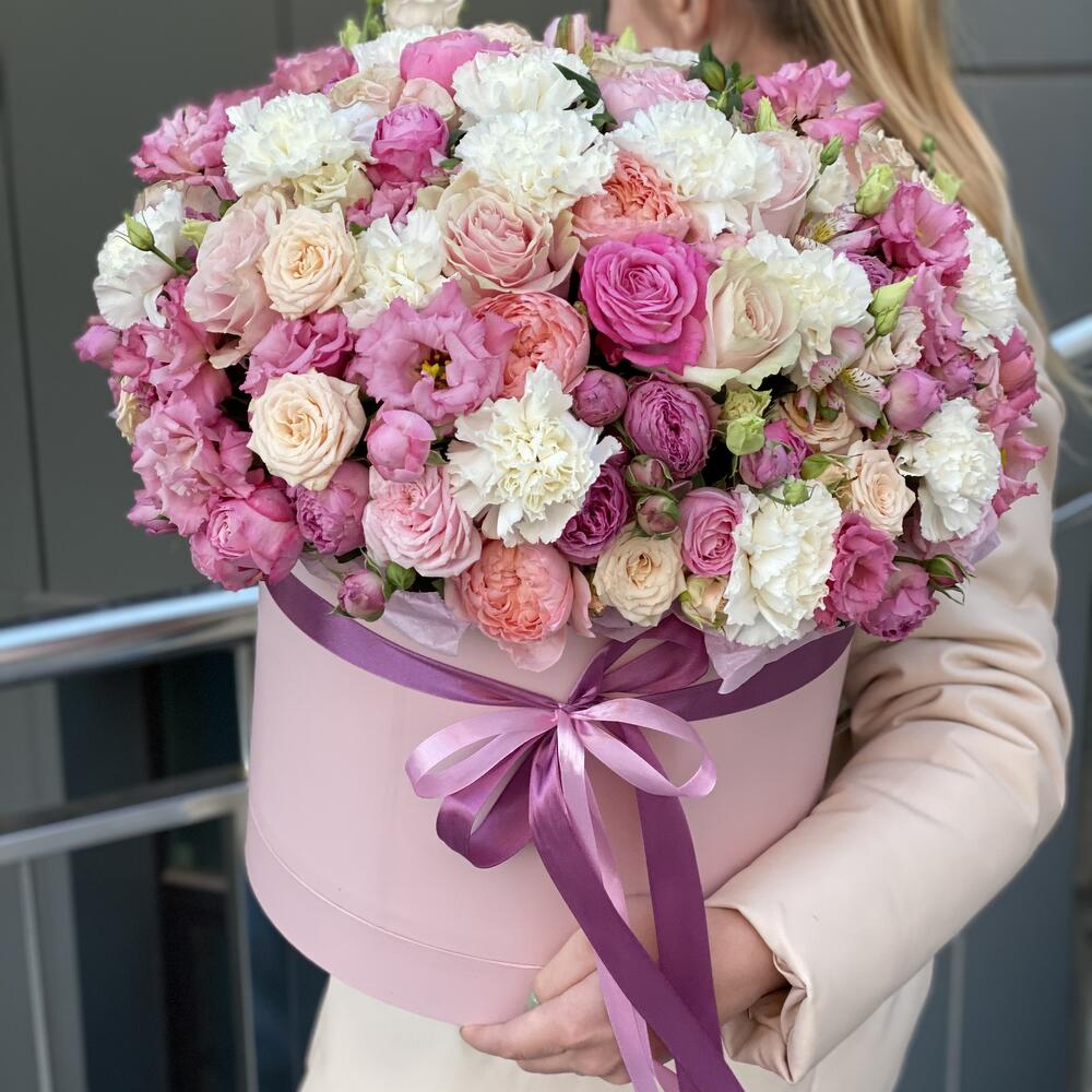 Огромная коробка с розой, эустомой, гвоздиками и альстромерией!