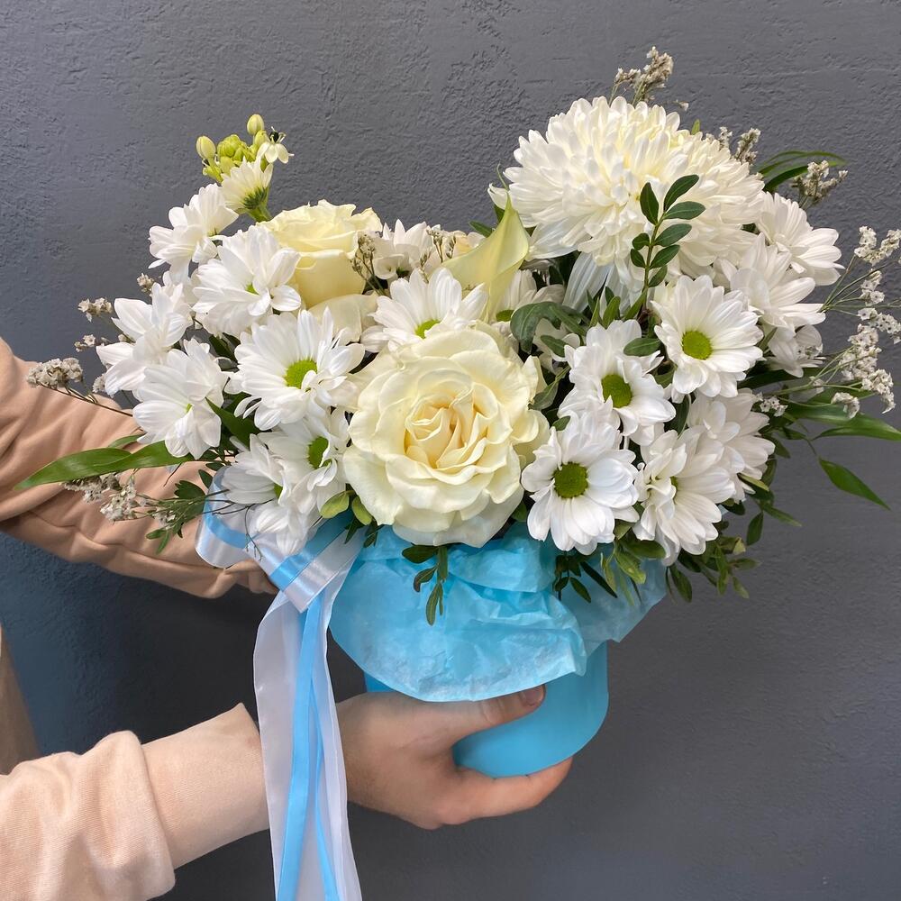 магнум белый – 1 шт.Роза – 3 шт.Лимониум – 2 шт.Ромашка кустовая – 3 шт.гиппеаструм – 1 шт.Зелень – 5 шт.Коробка шляпная – 1 шт.Оазис флористический – 1 шт.Лента атласная – 2 шт.