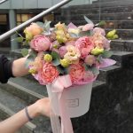 Шляпная коробка гортензией, пионами, эустомой, тюльпанами, гиацинтами, фрезией и гвоздикой "Джоанна"