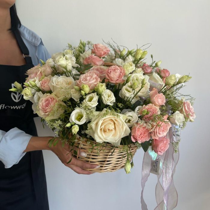 Роза Эквадор – 17 шт.Лента атласная – 2 шт.Фисташка – 7 шт.Корзина плетеная – 1 шт.Оазис флористический – 2 шт.эустома белая – 10 шт.Кустовая роза пионовидная – 10 шт.