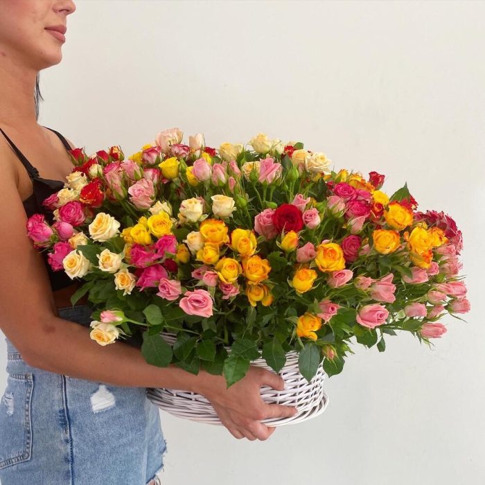 Роза кустовая – 81 шт.Корзина плетеная – 1 шт.Оазис флористический – 3 шт.