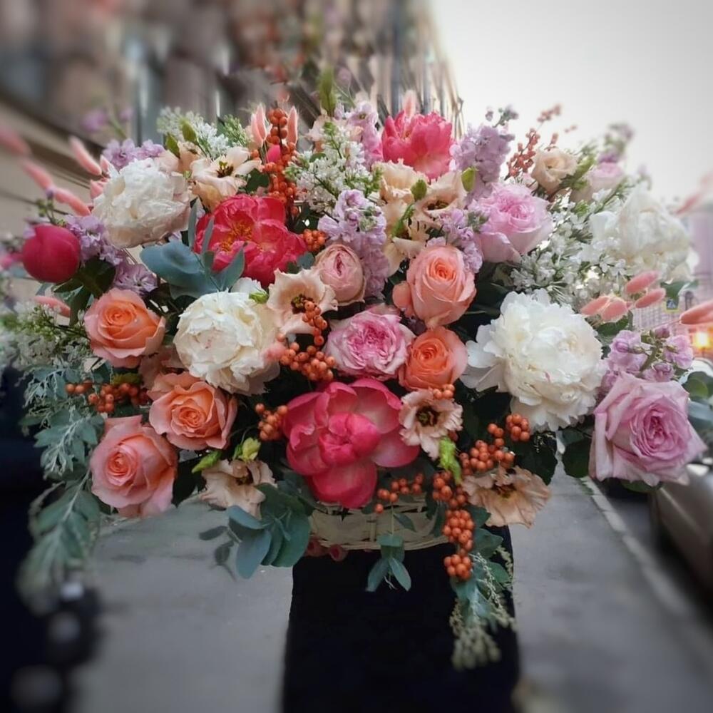 Корзина с пионами,маттиолой и пионовидными розами