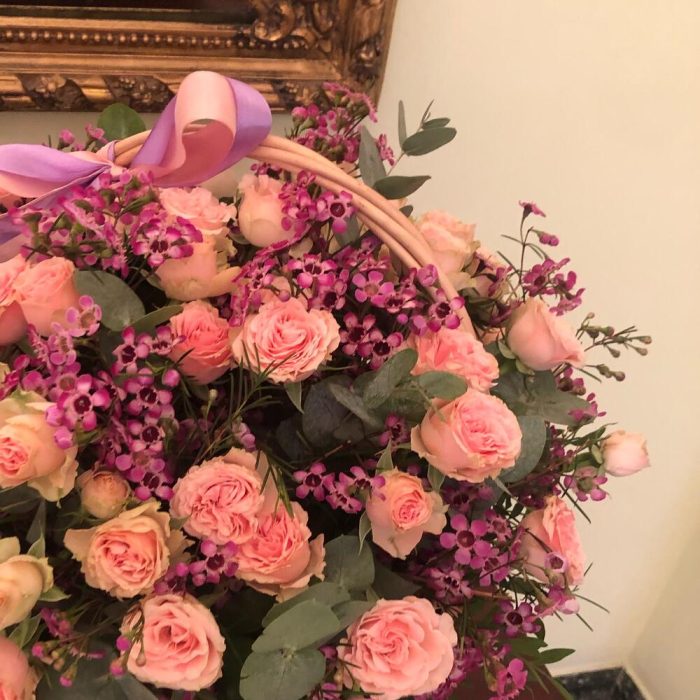 Кустовая роза – 11 шт.Ваксфлауэр – 3 шт.Эвкалипт Baby Blue – 7 шт.Оазис флористический – 1 шт.Корзина плетенная – 1 шт.