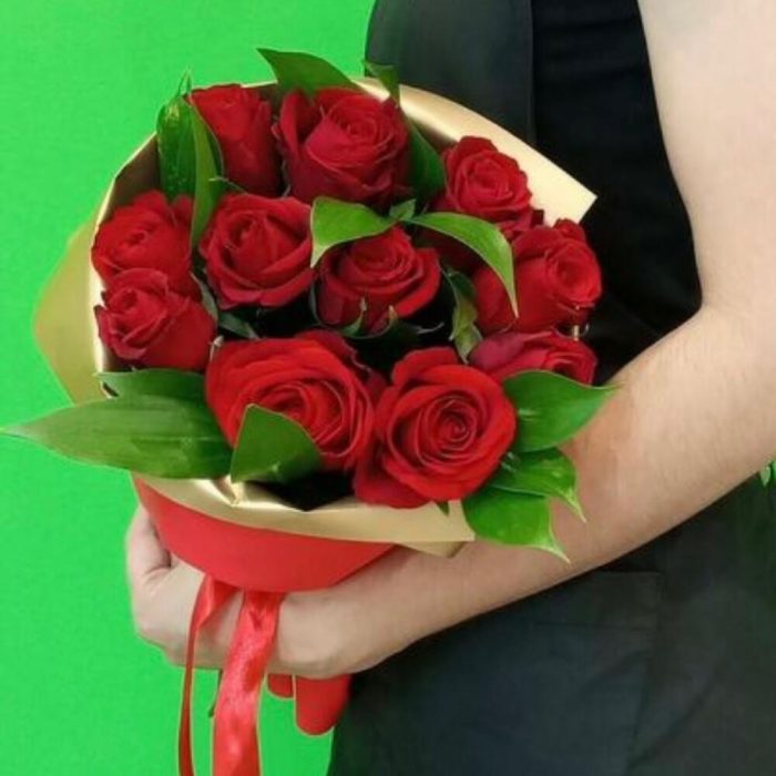 роза кения 50 см – 11 шт.Рускус – 7 шт.фоамиран лист – 1 шт.Лента атласная – 2 шт.