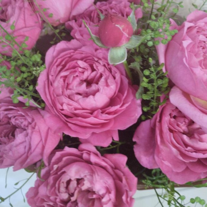 Роза кустовая пионовидная – 5 шт.Тласпи Green Bell – 2 шт.Крафт упаковка – 1 шт.