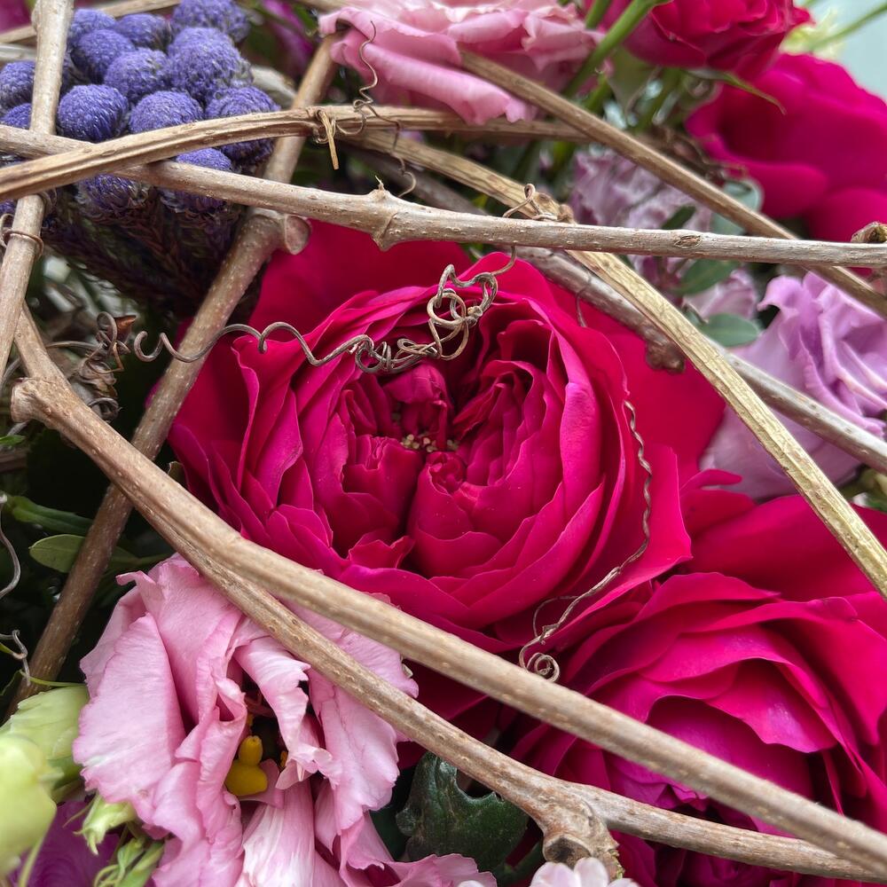 Роза пионовидная дэвида остина – 3 шт.Маттиола – 3 шт.Бруния – 3 шт.Сантини – 3 шт.Вероника – 3 шт.Роза кустовая – 2 шт.Диантус – 6 шт.ветки декоративные – 10 шт.Фисташка – 15 шт.Лента атласная – 2 шт.