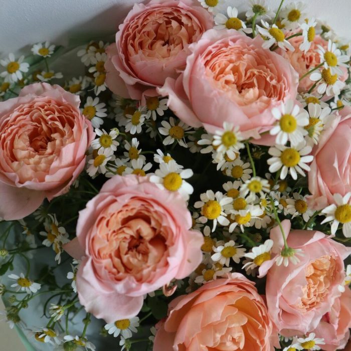роза кустовая джульетта пионовидная – 3 шт.Матрикария (Ромашка Камила) – 5 шт.тишью водостойкое – 5 шт.пленка глянцевая – 4 шт.Рафия – 1 шт.