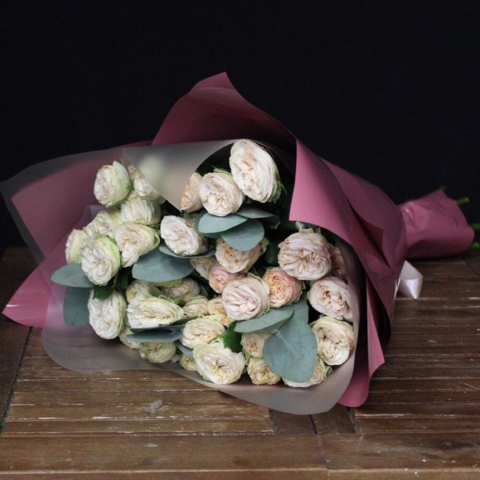 mono bouquet 114 из 7 кустовых пионовидных роз сорта trendsetter с эвкалиптом