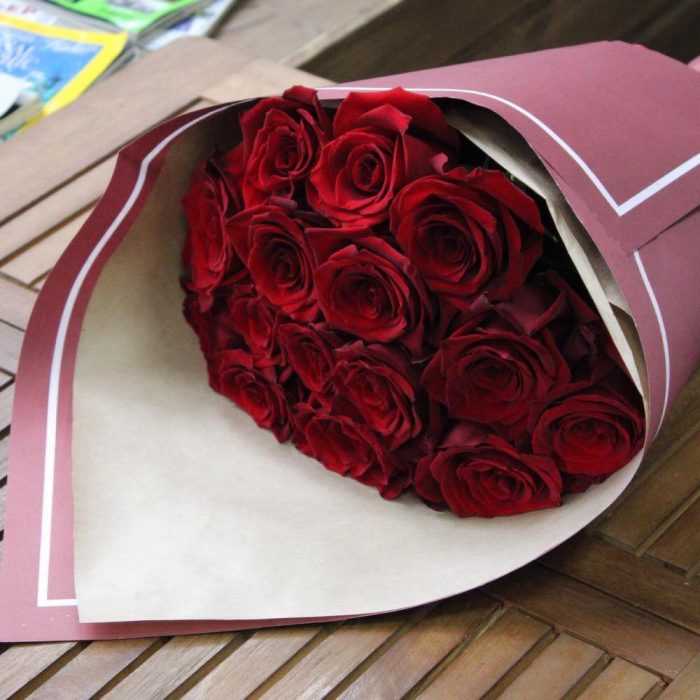 Роза Эквадор Премиум – 15 шт.Крафт дизайнерский – 1 шт.Лента атласная – 2 шт.Сердце – 1 шт.