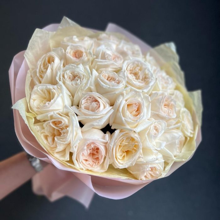 Лента атласная – 1 шт.Упаковка дизайнерская – 2 шт.роза вайт о хара( ароматная) – 25 шт.