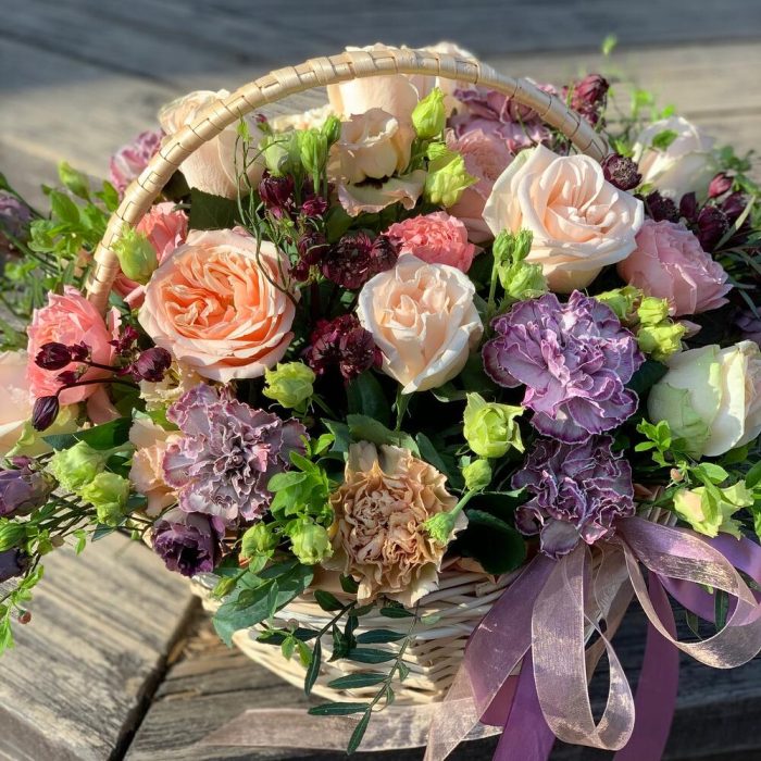 Роза пионовидная – 11 шт.Роза кустовая пионовидная – 3 шт.Диантус – 13 шт.Астранция – 3 шт.Лизиантус – 3 шт.зелень декоративная – 15 шт.Корзина плетеная – 1 шт.Оазис флористический – 2 шт.Лента атласная – 2 шт.