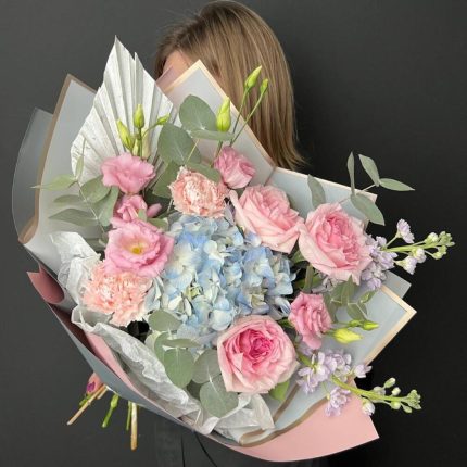 Роза пионовидная – 5 шт.Ранункулюс – 5 шт.Дельфиниум – 5 шт.Маттиола – 3 шт.Эустома – 3 шт.Ваксфлауэр – 2 шт.Озотамнус – 2 шт.Эвкалипт – 5 шт.Львиный зев – 3 шт.Упаковка – 1 шт.