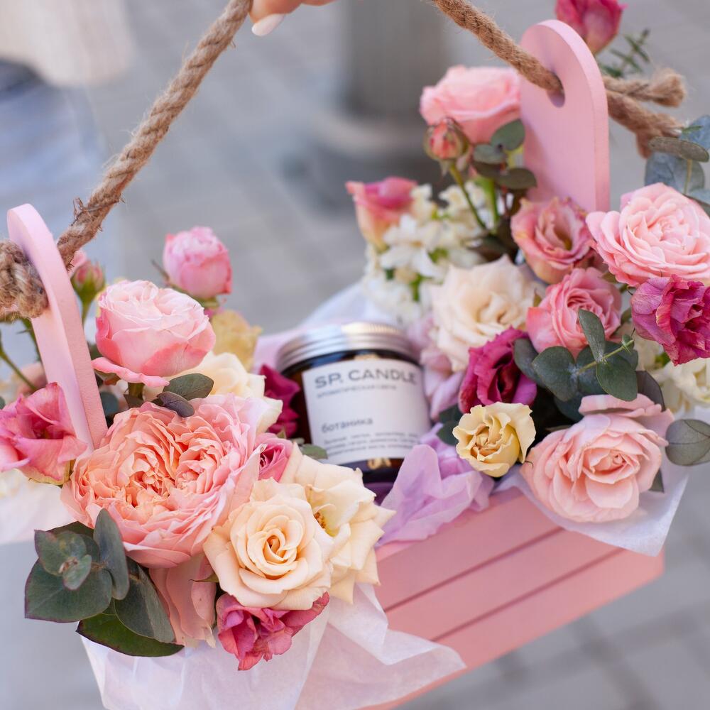 Роза кустовая джульетта – 1 шт.Роза кустовая Бомбастик – 3 шт.Лизиантус – 2 шт.Эвкалипт – 3 шт.Ящик деревянный – 1 шт.Свеча ароматическая – 1 шт.