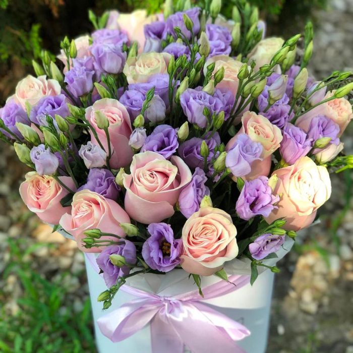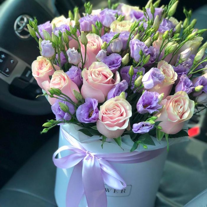 Коробка шляпная – 1 шт. эустома лиловая – 10 шт. Роза пинк мондиаль – 15 шт.