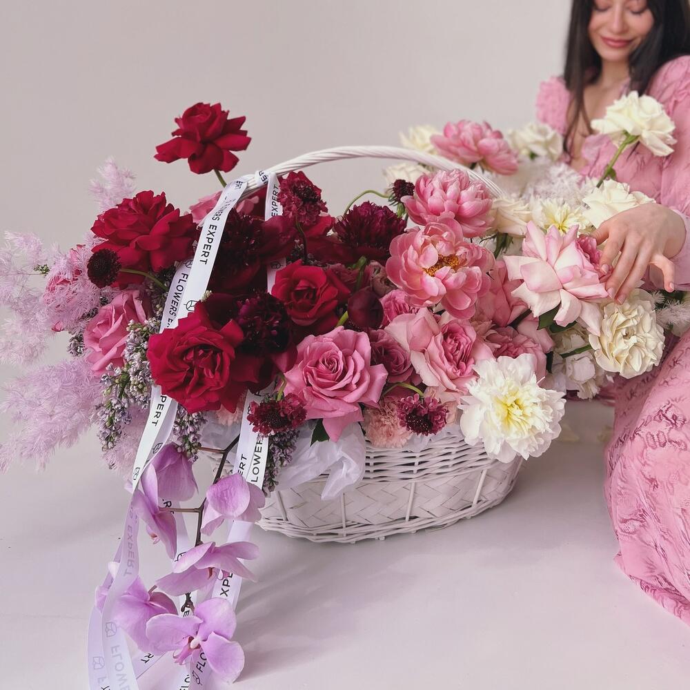 Пион – 5 шт.Сирень – 5 шт.Корзина плетеная – 1 шт.Французская роза – 19 шт.Фаленопсис – 1 шт.