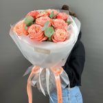 Букет из пионовидных роз кахала в дизайнерской упаковке.Букет перевязан атласными лентами.Можем подобрать шарики в цвет букета (напишите нам об этом).