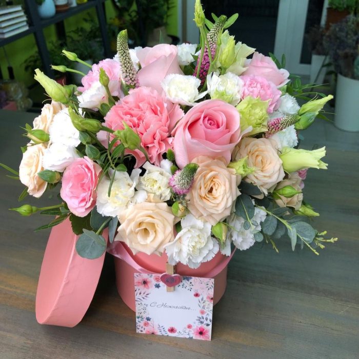 Лизиантус – 2 шт.Роза кустовая – 2 шт.Роза – 3 шт.Шляпная коробка с лентами – 1 шт.Оазис флористический – 1 шт.зелень декоративная – 3 шт.зелень микс – 5 шт.диантус микс – 6 шт.