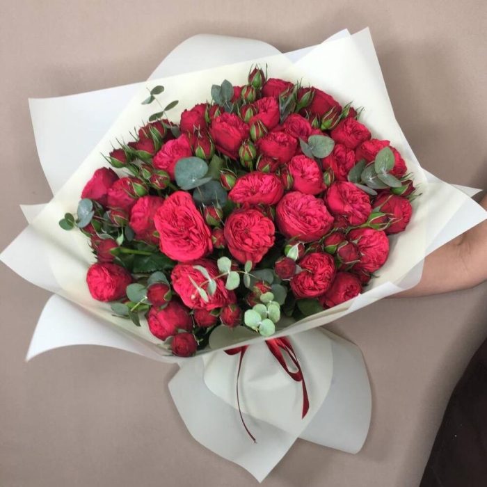 Лента – 1 шт.Эвкалипт – 4 шт.Пионовидная роза – 35 шт.Оформление – 1 шт.