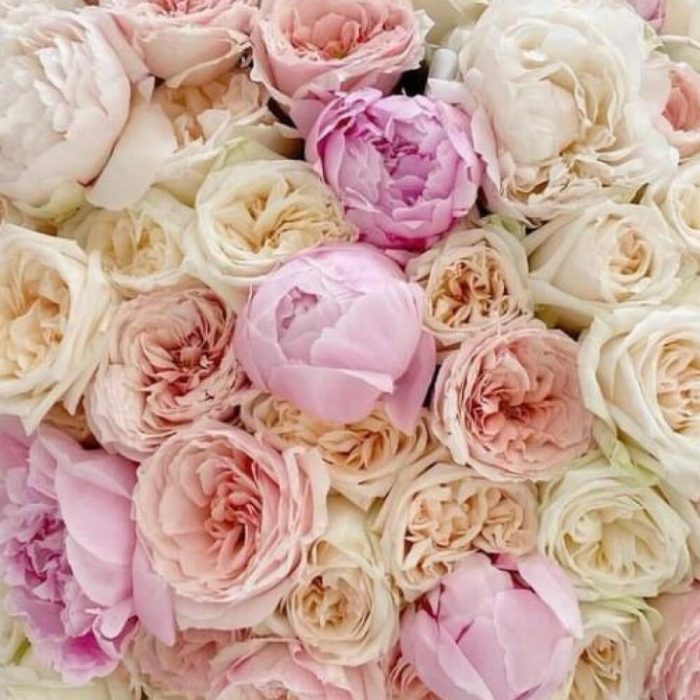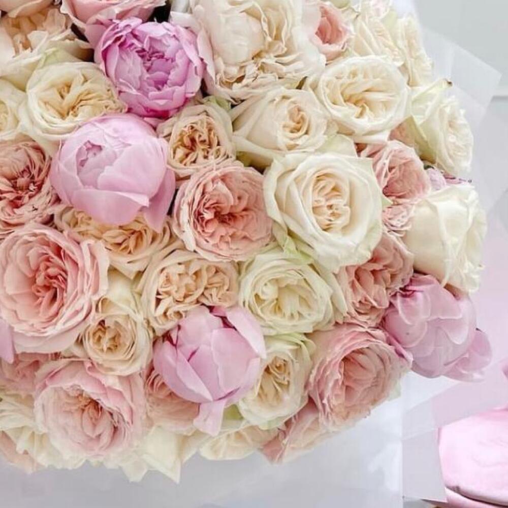 Пион розовый – 9 шт.розы пионовидные – 42 шт.Упаковка дизайнерская – 2 шт.Лента атласная – 2 шт.Открыточка с вашими пожеланиями – 1 шт.хорошее настроение – 100 шт.инструкция по уходу за цветами – 1 шт.коробка переноска – 1 шт.Кризал – 1 шт.