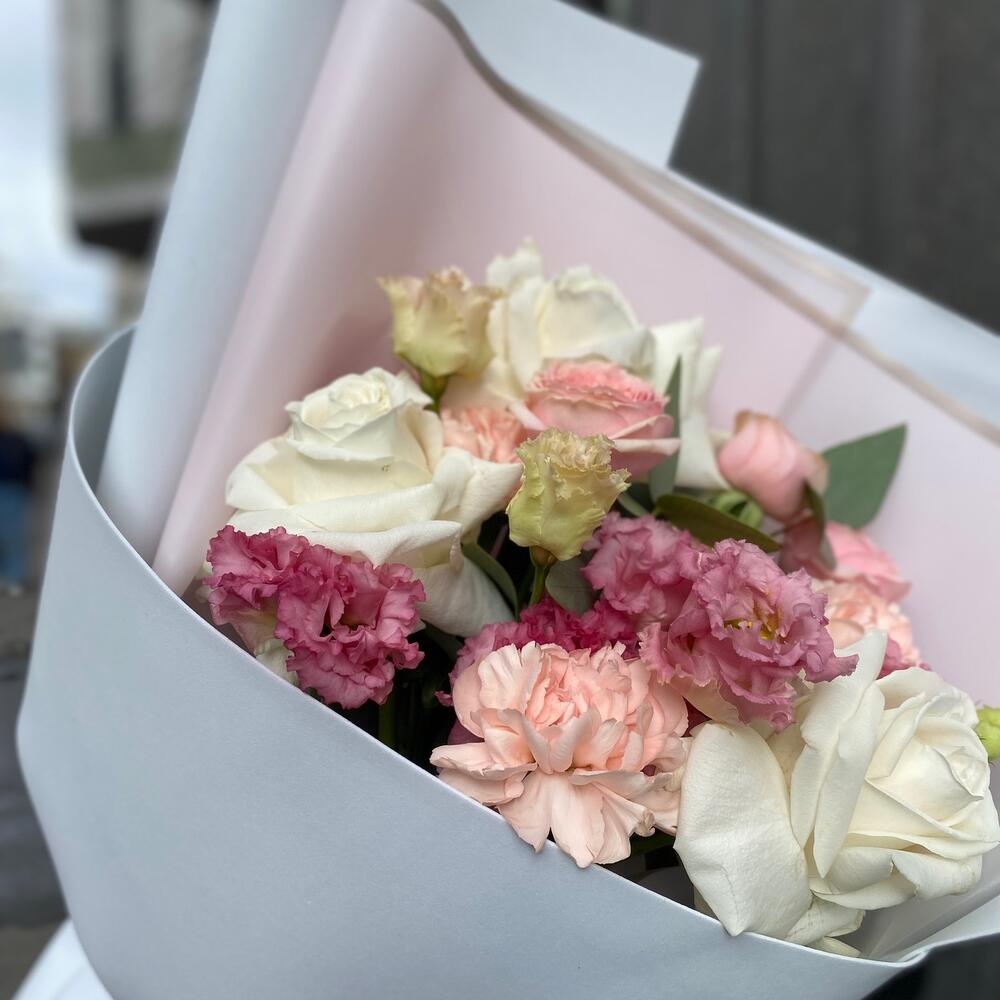 Гвоздики, Лизиантусы, Розы, Тюльпаны