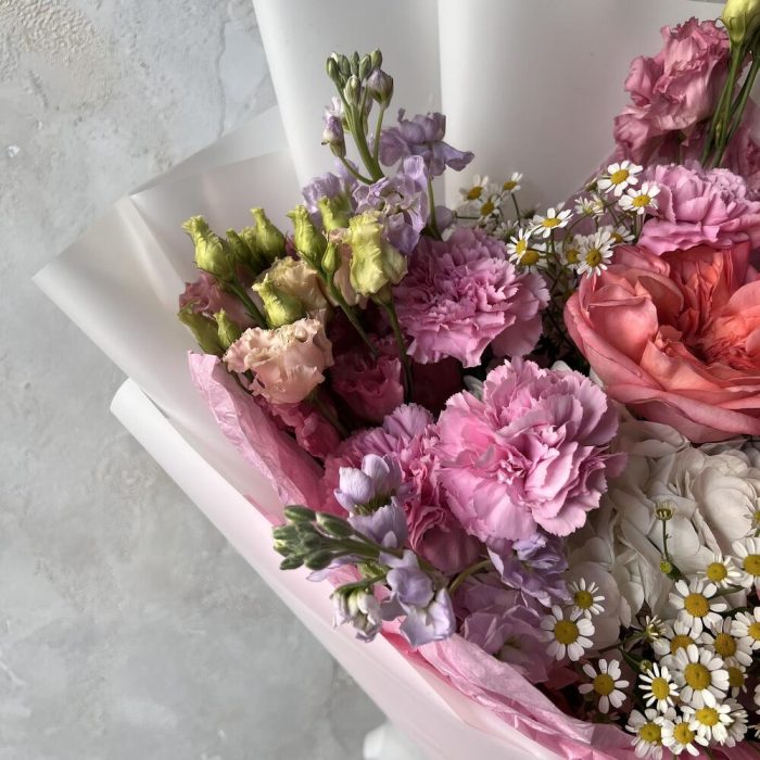 Гортензия – 1 шт.Лизиантус – 3 шт.Маттиола – 3 шт.Роза – 3 шт.Гвоздика – 5 шт.Матрикария – 3 шт.Авторская упаковка – 1 шт.
