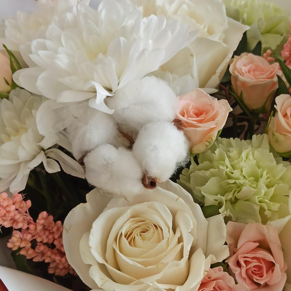 Букет ароматных роз с хлопком и лизиантусом