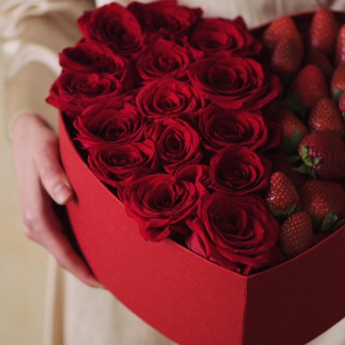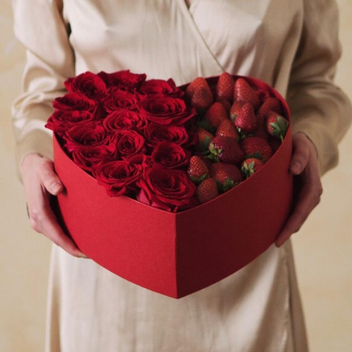 Шляпная коробка – 1 шт.Роза – 15 шт.Клубника – 300 гр.