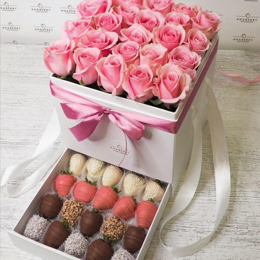 Шкатулка с цветами и клубникой в шоколаде «Розы микс»